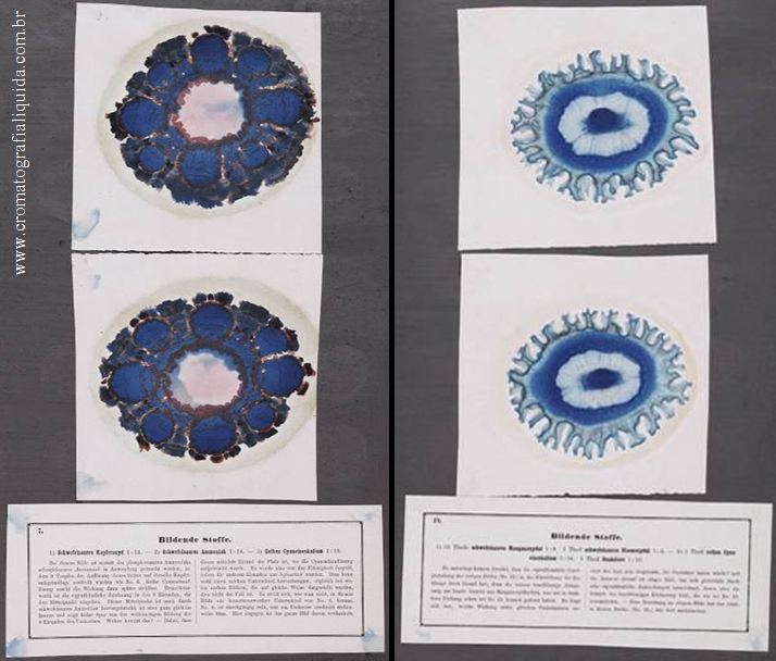 ![]() Páginas do livro de 1855 de F.F.Runge ilustrando a reprodutibilidade de suas separações, realizadas sempre em duplicata. |